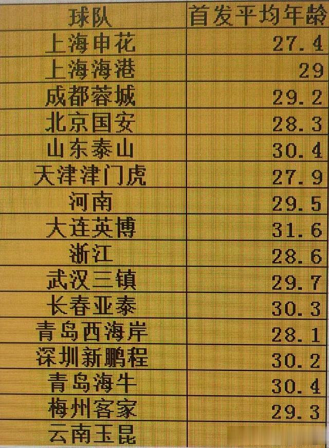 16支球队中有14支的首发阵容平均年龄超过28岁,仅有申花(27.4岁)津门虎(27.9岁)两支球队例外,相反有5支球队的首发阵容平均年龄超过了30岁,大连英博更是达到了31.6岁。
