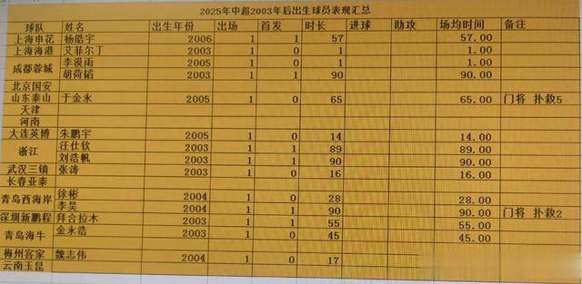 8场比赛全部出场球员中,2003年以后出生的仅有14人,其中仅6人首发,没有贡献任何的进球或者助攻。首发的6人中,除了申花的杨皓宇和青岛西海岸的李昊,其余4人都是上赛季就已经在球队获得一定地位的的老面孔:胡荷韬,汪仕钦,刘浩帆,拜合拉木,这4名球员,无一例外全部都是2003年出生,今年已经22岁,严格来说已经不属于年轻球员。